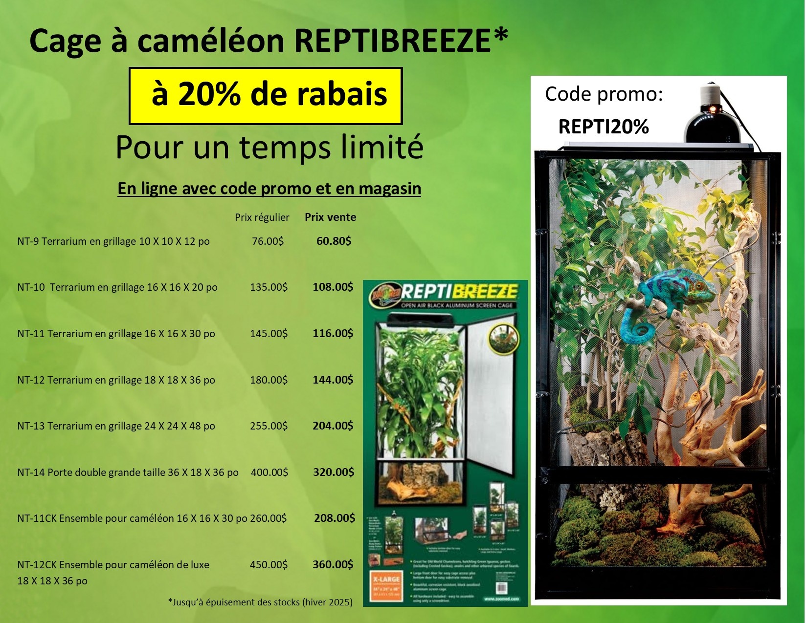 Pour un temps limité ou jusqu'à épuisement des stocks, nos cages grillagées pour caméléon sont à 20% de rabais en magasin et en ligne avec code promo REPTI20%